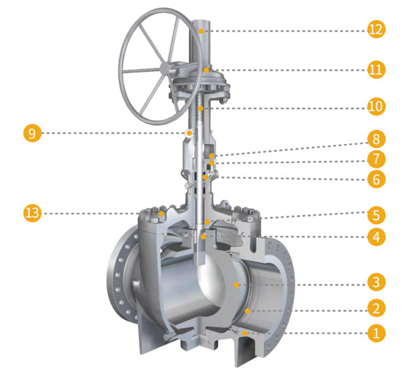 1. 阀体 2. 阀座 3. 阀芯 4. 滚柱 5. 阀盖衬套 6. 填料 7. 填料压盖 8. 活接螺栓 9. 阀杆导向销 10. 阀杆 11. 驱动装置 12. 防尘罩 13.阀盖